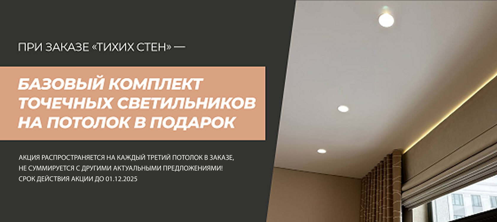 При заказе «Тихих стен» — базовый комплект точечных светильников на потолок в подарок.