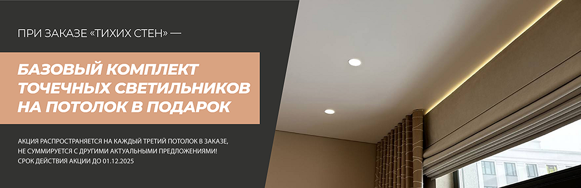 При заказе «Тихих стен» — базовый комплект точечных светильников на потолок в подарок.